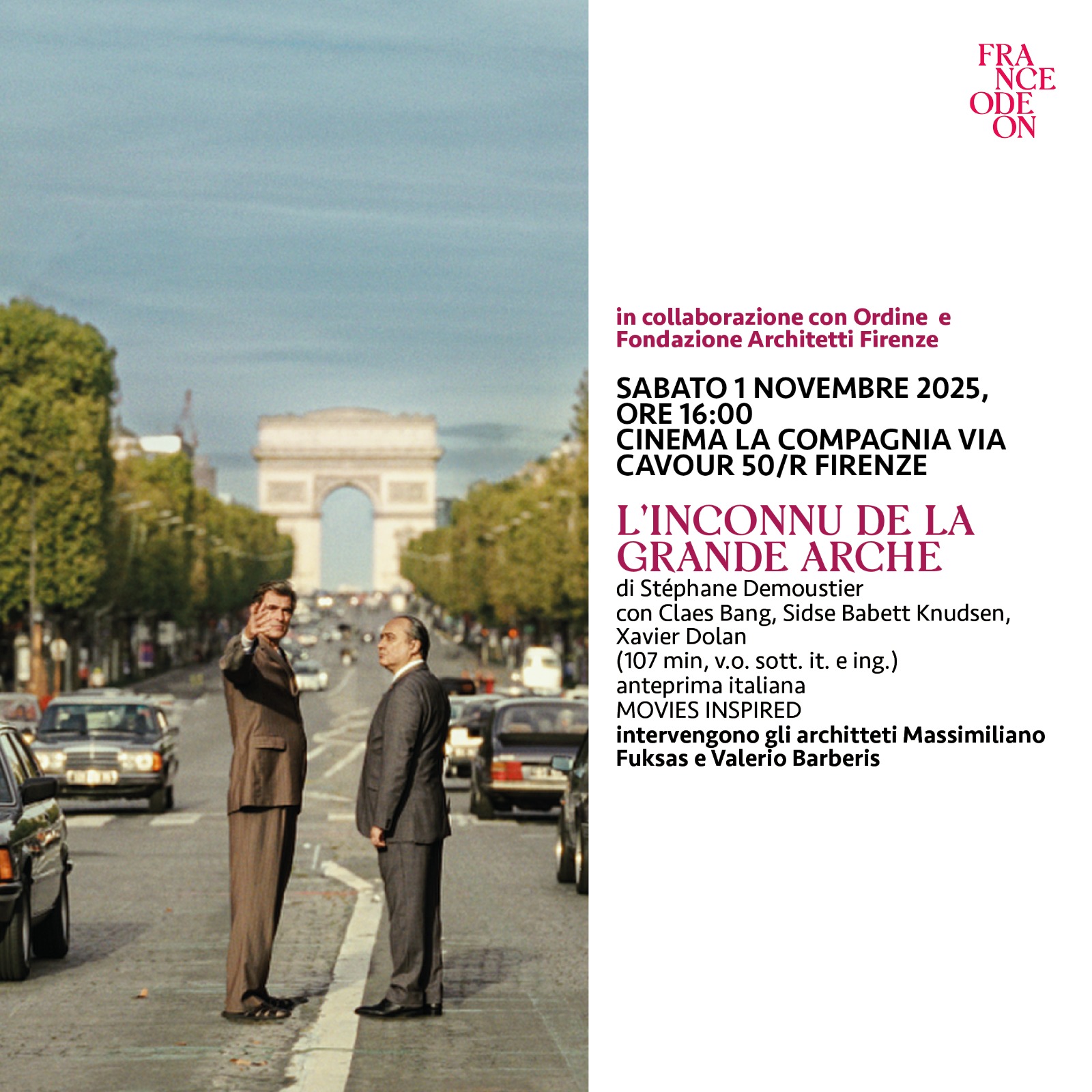 Sabato 1 novembre, alle ore 16.00, al Cinema La Compagnia di Firenze, all’interno del Festival del Cinema Francese France Odeon, sarà proiettato il film di Stéphane Demoustier L’inconnu de la Grande Arche, con l’intervento degli architetti Massimiliano Fuksas e Valerio Barberis. L’evento è organizzato in collaborazione con Ordine e Fondazione Architetti Firenze.